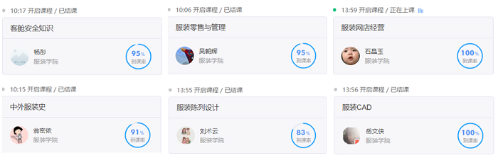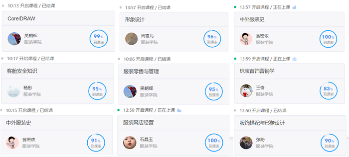 通过考勤记录,大部分同学能够按时上课,有请假的同学也能提前告知教师。教师们会在课中多次强调考勤制度,严抓课堂学习质量。教师网络课程均能使用微信、QQ、腾讯会议、雨课堂、第三方媒体网站等。多方平台进行教授。大部分教师能使用雨课堂进行授课。