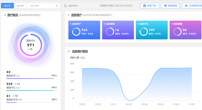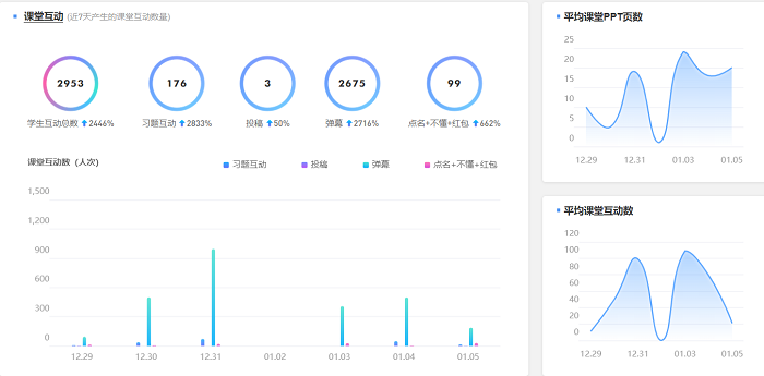 通过太阳成集团tyc9728所开设课程雨课堂的使用量显示,公司教师和员工使用雨课堂教学的比例得到了大幅提升,覆盖了除2018级本科毕业年级外的971名太阳成集团tyc9728同学,活跃员工及教师的人数较多。课堂互动量达到2953次,如下图所示。