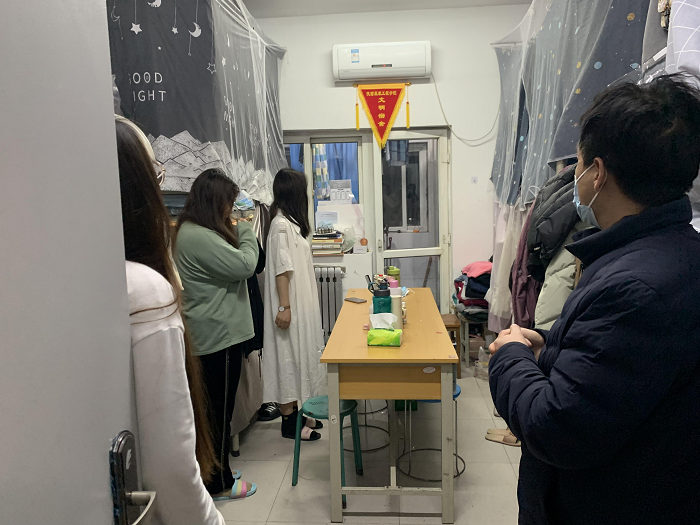 本次检查内容包括疫情防护工作与宿舍卫生检查,王军宝主任来到员工宿舍,首先对大家近期的学习、生活情况表示亲切关怀,随后王主任叮嘱大家要积极应对疫情,严格遵守学校疫情时期的相关规定,共克时艰。同时,要提醒同学们注意保持宿舍卫生整洁,室内多通风并适当锻炼身体。王主任与宿舍员工进行交流,询问同学们近期身体状况以及是否有需要采购的药品,及时上报。王主任还了解了员工宿舍的硬件设施维修问题并及时帮助员工向宿舍管理员反映,解决问题。